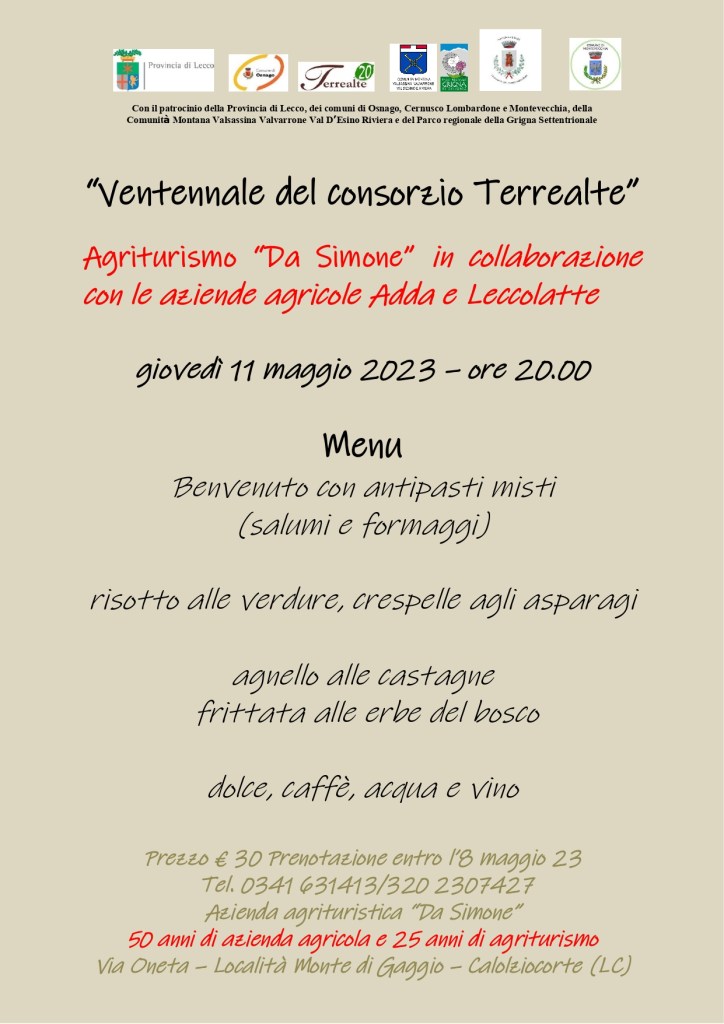 Articolo precedente Le proposte del fine settimana di Terrealte! Il mercato agricolo di Osnago sarà regolarmente aperto sabato 13 maggio, dalle 7.30 alle 12.30, con il ritorno del produttore di vino di Montevecchia Maggioni Francesco. Attenzione al menu di maggio dell’agriturismo “I Gelsi”! Continua l’iniziativa “Noi ci mettiamo la faccia” da parte dei soci del consorzio Terrealte! Domenica 14 maggio è la festa della Mamma e al mercato di Osnago sarà possibile acquistare c/o la Floricoltura Cereda fiori per l’occasione festiva!