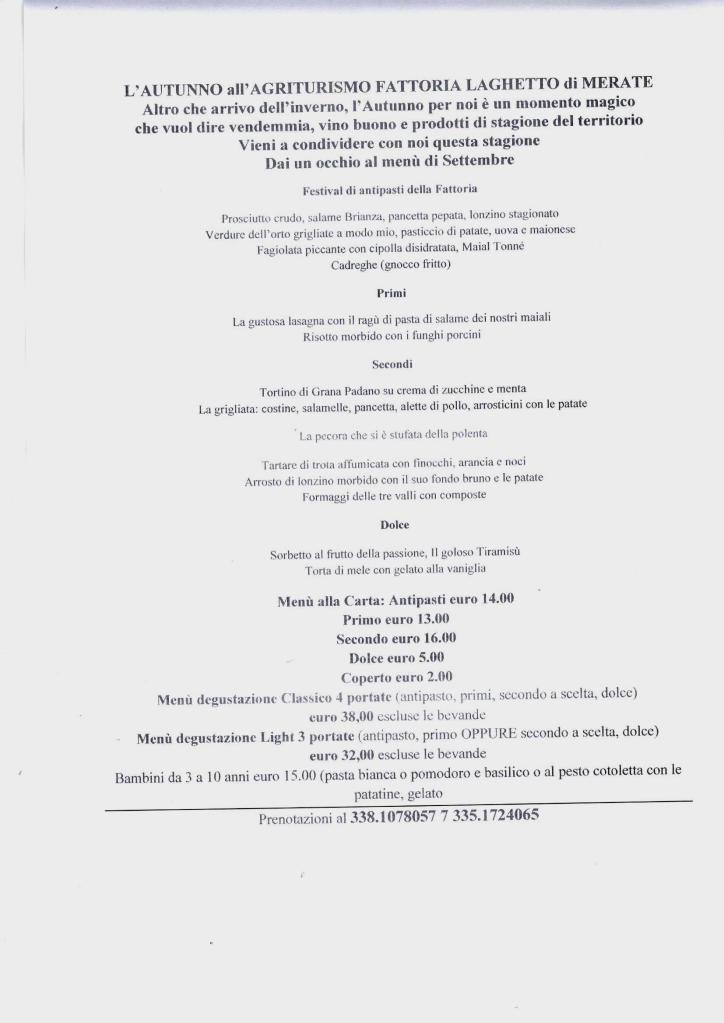 Menu del mese di settembre c/o l’agriturismo “Laghetto” di Merate