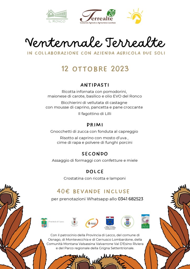 Giovedì 12 ottobre, alle ore 20.00, c/o l’agriturismo “Il Ronco” di Garlate, una indimenticabile serata Eno Gastronomica! Il menu prevede anche l’utilizzo dei buonissimi formaggi di capra dell’azienda agricola “Due Soli” di Primaluna ospite della serata!